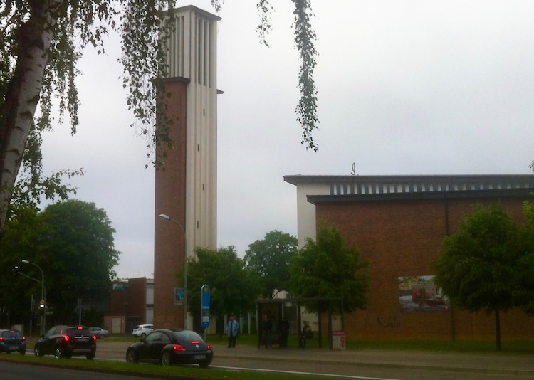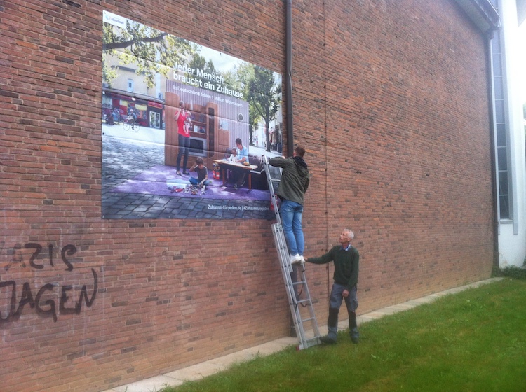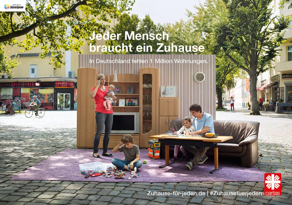 Unter dem Motto „Jeder Mensch braucht ein Zuhause“ macht sich die Caritas bundesweit stark für bezahlbaren Wohnraum. Mit einem großen Fotoplakat wirbt der Sozialverband nun auch an der Außenmauer der Kirche St. Godehard in Göttingen für die Jahreskampagne 2018. „Wir freuen uns sehr, dass die Pfarrgemeinde das möglich macht“, sagt Maria Weiss aus dem Caritas-Centrum Göttingen gleich nebenan. Das Motiv zeigt auf 3,5 mal 2,5 Metern eine Familie, die mit ihrem Wohnzimmer auf einem gepflasterten Platz unter Bäumen wohnt.