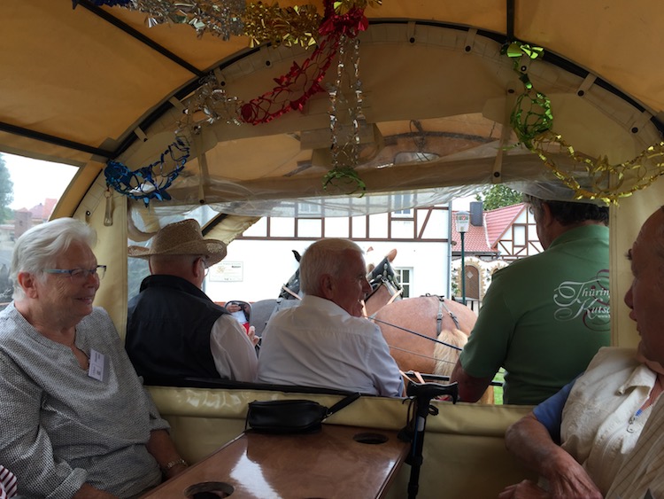 Es war ein Ausflug ins Grüne angekündigt. Nun wurde das Geheimnis gelüftet, indem die Projektleitung als Rancherin auftrat und den Tagesausflug mit einem Kutschplanwagen um den Sonnenstein herum ankündigte. Nach einer romantischen Anfahrt zum Pferdehof oberhalb von Brehme bestiegen wir die beiden Pferdegespanne und für einen Kleinbus gab es die Sondergenehmigung auf das Plateau des „Skywalk“ Sonnenstein. Bereits nach wenigen Minuten wurden in dem Planwagen fröhlich die typischen Lieder von „…hoch auf dem gelben Wagen…“ angestimmt.
